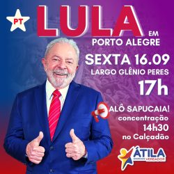 O PAI TÁ ON E VEM AÍ SEXTOU COM LULA LULA EM PORTO ALEGRE NESTA SEXTA-FEIRA, 16 DE SETEMBRO Comício da Vitória a partir das 17 horas, no Largo Glênio Peres, no Centro de Porto Alegre.Atenção galera de Sapucaia!Concentração a partir das 14h30 no Calçadão de Sapucaia do Sul Pega a bandeira vem pra rua vem […]