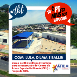HOJE É DIA DE #TBT!Relembre conosco as políticas públicas e investimentos dos Governos Lula, Dilma e Ballin na nossa cidade e comprove que o PT ajudou a transformar Sapucaia do Sul para melhor. ️ESPORTE, LAZER E CIDADANIAINVESTIMENTO: cerca de R$ 3 milhõesEMPREENDIMENTO: Centro de Arte e Esporte Unificado (CEU) – PRAÇA DO CEU, hoje chamada de […]