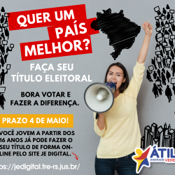 Quer um país melhor pra ti e para todos? Faça seu título eleitoral e bora votar e participar da mudança que você tanto deseja! Você jovem a partir dos 16 anos já pode fazer o seu título por meio do site JE Digital. ACESSE: https://jedigital.tre-rs.jus.br/ NÃO ESQUEÇA: O prazo é até 4 de maio! MAIS […]