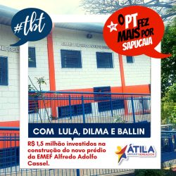 HOJE É DIA DE #TBT!Relembre conosco as políticas públicas e investimentos do PT em Sapucaia do Sul. O PT TRANSFORMOU A EDUCAÇÃO DOS SAPUCAIENSES! Foi com os Governos LULA, Dilma e Ballin, que Sapucaia recebeu 4 novas Escolas de Educação Infantil: Dalila da Silveira Oliveira, Mara Mattos, Professora Simone Serafim e Izabel Cristina Souza da Costa. […]