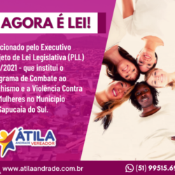 AGORA É LEI!Foi sancionado pelo Executivo o Projeto de Lei Legislativa (PLL) 085/2021, de minha autoria, que institui o Programa de Combate ao Machismo e a Violência Contra as Mulheres no Município de Sapucaia do Sul. A LEI MUNICIPAL Nº 4.190, DE 26 DE ABRIL DE 2022, objetiva contribuir no combate e prevenção ao machismo […]
