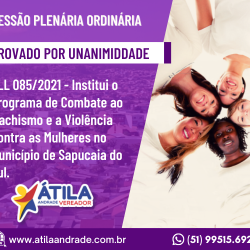 APROVADO POR UNANIMIDADE EM PRIMEIRA VOTAÇÃO! Foi aprovado também na Sessão desta manhã, por unanimidade e em primeira discussão e votação, o Projeto de Lei de minha autoria, que Institui o Programa de Combate ao Machismo e a Violência Contra as Mulheres no Município de Sapucaia do Sul. O Projeto de Lei tem como objetivo […]