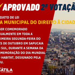 Foi aprovado por unanimidade o Projeto de Lei que institui o Dia Municipal do Direito à cidade em Sapucaia do Sul. A ideia é que a data seja celebrada anualmente em toda a primeira segunda-feira do mês de outubro, durante a semana de comemoração do Dia Mundial do Habitat, designado pela ONU. O objetivo é […]